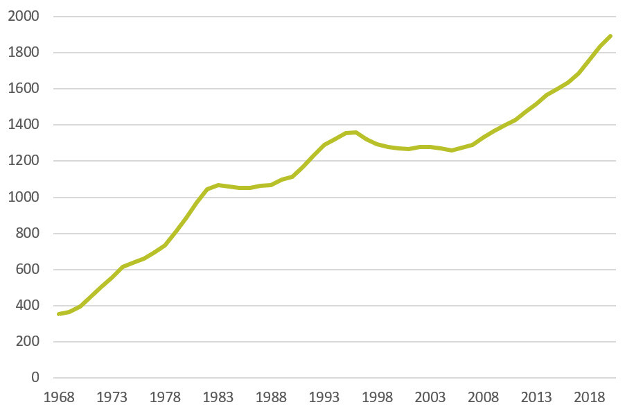 Kostenentwicklung der Baukosten pro qm im Hausbau 1968 bis 2019 Quelle: Statistisches Bundesamt (Hrsg.) (2018): Baugenehmigungen / Baufertigstellungen Baukosten –