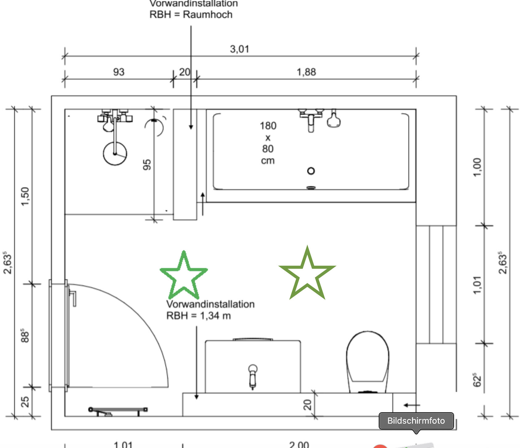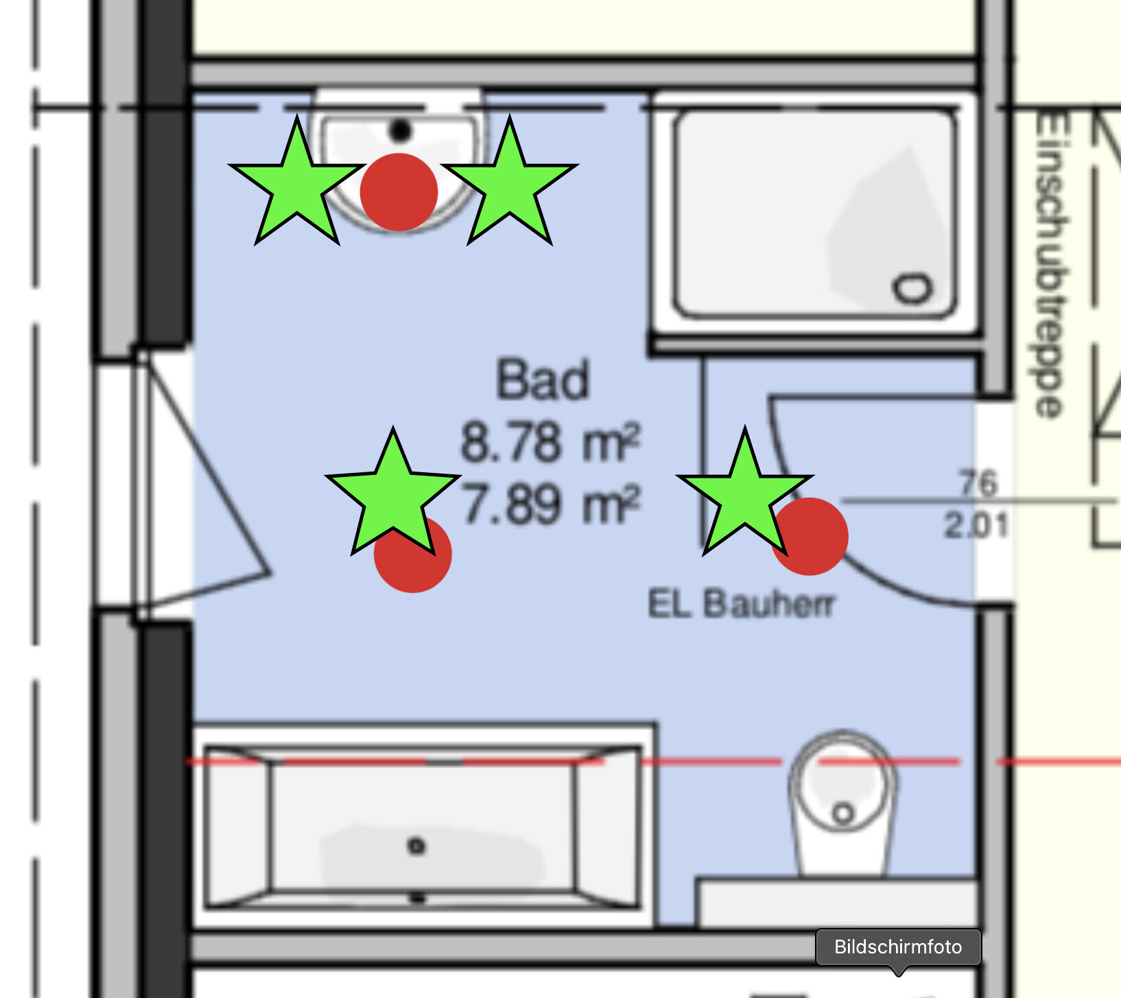Von der Lage her favorisiere ich natürlich rot, also raumzentral. Aber grün würde wohl die Duschnische besser ausleuchten - oder ist das bei der Raumform und -Größe irrelevant, weil wandreflektiertes Licht auch die Nische genügend treffen würde?Kommt auch auf die Leuchte an. Ich würde zwei Auslässe wählen und das Leuchtmittel entsprechend anpassen.Andre77 schrieb: