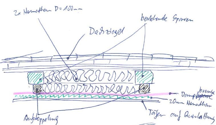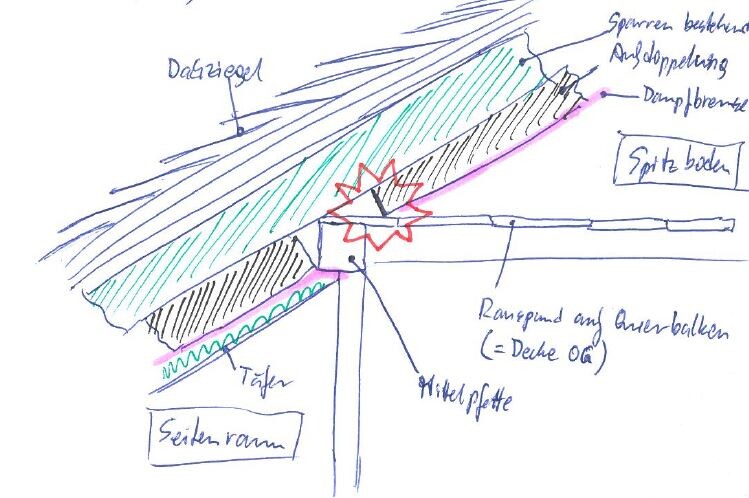 Ich habe in meinem alten Appenzeller Holzhaus bereits die Seitenräume saniert. Jetzt soll der Spitzboden drankommen. Auf den beiden beiliegenden Skizzen (Schnitt durch Sparren und Schnitt durch die Mittelpfette) habe ich es aufskizziert.