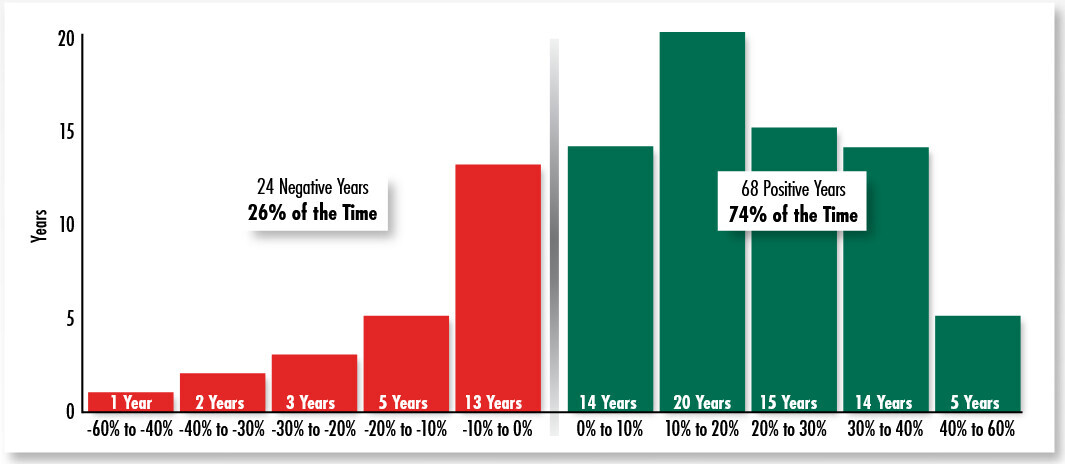 Es ist aber klar zu sagen, dass die Chance für einen Kursgewinn bei Aktien genauso hoch wie ein Verlust des Kurses ist (50%/50%).Das ist Quatsch, denn die Verteilung ist nicht 50/50 sondern eher so 3:1 für den S&P 500, sprich 3 positiven Jahren steht ein negatives gegenüber Und selbst wenn die Chancem 50/50 wären, sagt das noch lange nichts über Risiko und Auszahlung aus. Mal ein plakatives Beispiel. Du spielst russisch Roulette. In 5 Fällen bekommst du 10 Millionen, in einem Fall bist du unter der Erde. Mit halbseidener Mathematik bist du sehr wahrscheinlich Multimillionär und solltest das Spiel machen.Auf eine Einzelaktie hast du tatsächlich das Problem, dass du im schlimmsten Fall das Spiel verlässt. Durch Diversifikation ist aber zum einen der mögliche Verlust jeder Position begrenzt und es wirft dich nicht aus dem Spiel. Und das ist die eigentliche Magie hinter Ergebnissen wie diesem hier (S&P500, 1926-2017):