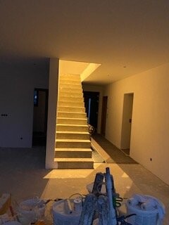 -Treppenbeleuchtung als Wandeinbauspots, Wandleuchten oder LED-Strips unter der Treppe.