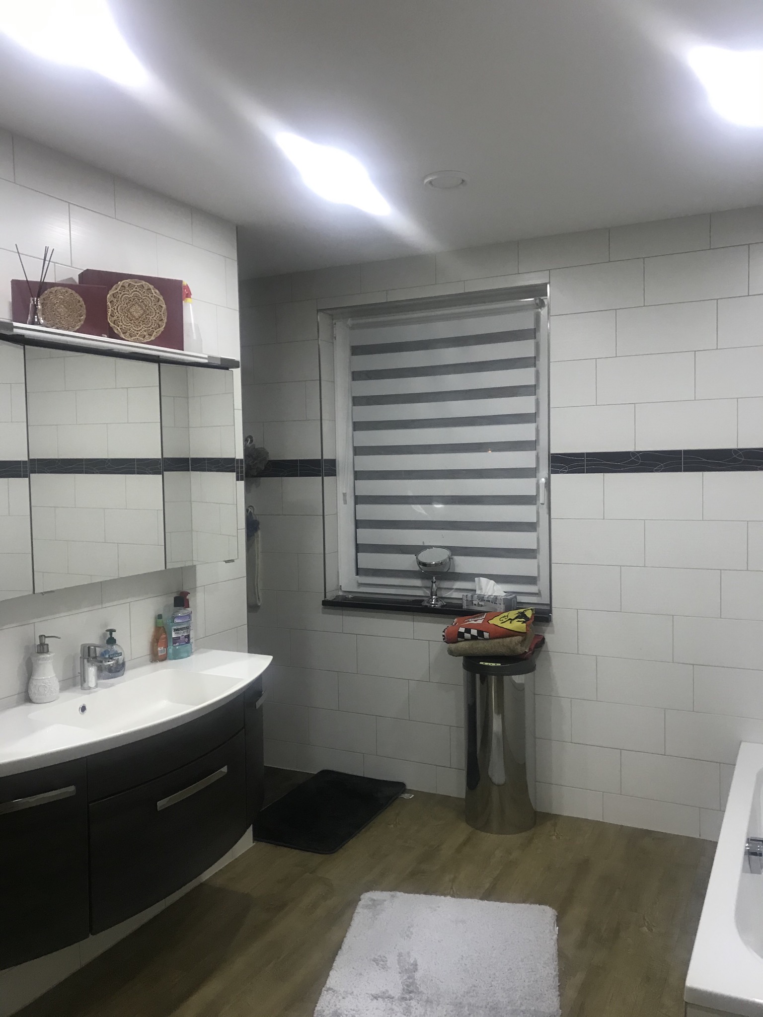 Und ja, die versetzten Heizdinger, argh.Kann man so sehen.Die dritte Leuchte wollte ich nicht, die Einbauleuchten lassen sich auch so einstellen, dass da kein dunkler Bereich entsteht. Ich fand es etwas akzentuiert erheblich schöner - vor Allem wenn man auf der anliegenden Außenterrasse sitzt.