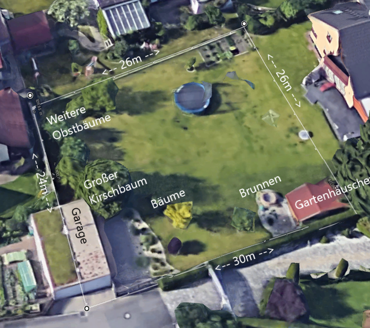 Außerdem habe ich noch eine Satellitenansicht mit Beschriftungen der relevanten Objekte und der Strecke der Außenkanten erstellt.