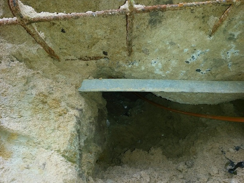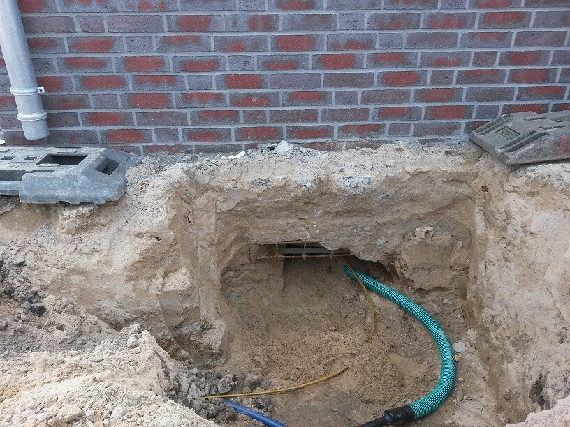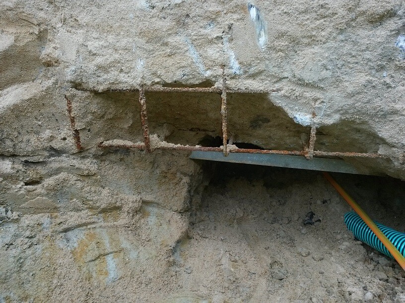 Dann werden Bohrungen am bestehenden Fundament durchgeführt und ein neues Fundament einmal um das Haus gegossen. Zwecks Verbindung werden in den Borhugnen Eisen eingesteckt.