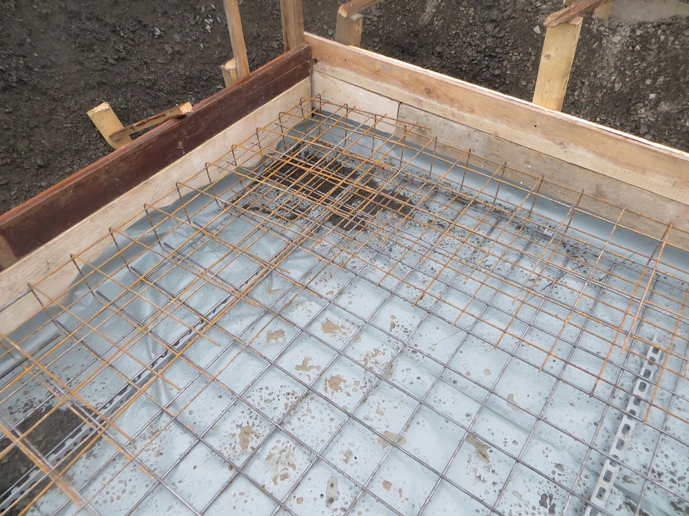 Da die Bodenplatte seitlich alles andere als gerade ist, wurde wahrscheinlich vor dem Gießen keine Schalung gebaut, daher die undefinierte Abstände zwischen der Bewährung und Erdboden.