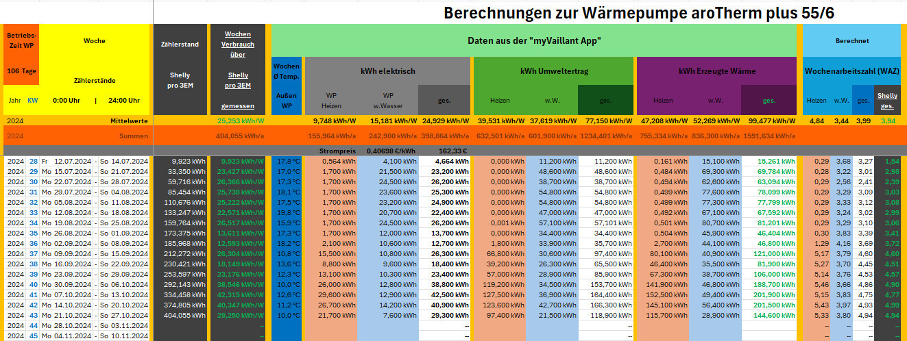 Zur Zeit haben wir nun im Oktober einen gesamt COP von 4,2 , Heizung 4,9 und WW 2,9. Der COP beim Warmwasser ist seit Änderung der Warmwasserproduktion von Nachts auf Nachmittags von ca. 2,7 auf ca. 3,3 gestiegen, umgestellt habe ich vor einer Woche.