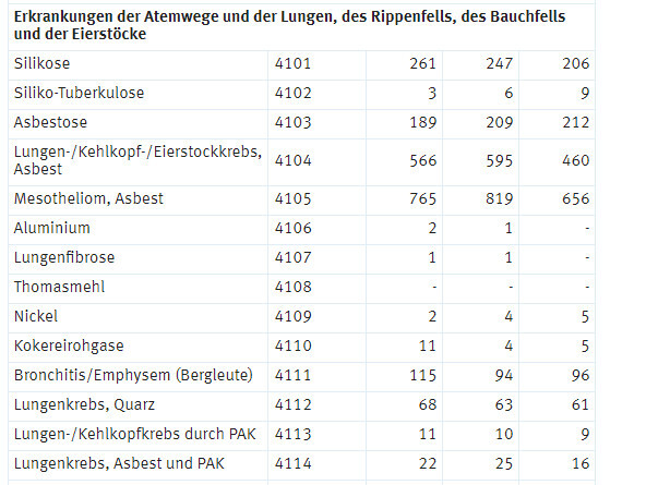 Etwa 50% der jährlichen Toten aufgrund von Berufskrankheiten resultieren aus dem Umgang mit Asbest (in der Vergangenheit - viel Asbest, kein/kaum Schutz, lange Zeit Asbestfasern ausgesetzt),