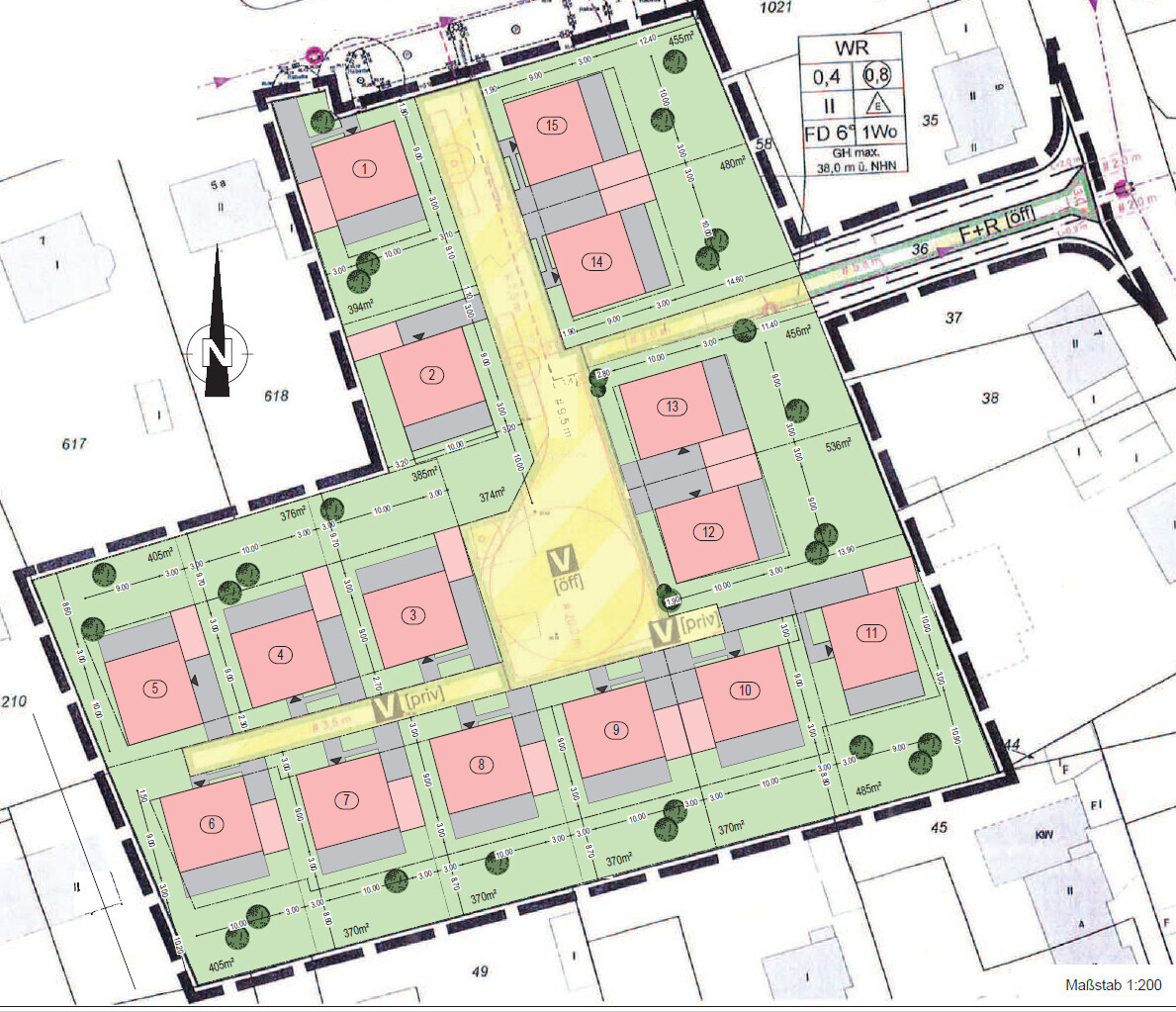 Des Weiteren packe ich den Bebauungsplan mal dazu. Wenn ich die Begründung richtig lesen, dann dürfen Garagen usw. nur im Bebauungsfenster oder aber in den für Garagen, Carports und Stellplätzen festgelegten Flächen (diese wären bei den Häusern 1, 2, 3 und 11).