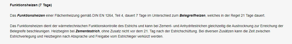 in unserem neuen Büro sprach der Vermieter von 50° Aufheiztemperatur. Ich glaube es geht auch (oder genau?) darum Spannung aus dem Estrich herauszubekommen ...Jep. Es gibt zwei verschiedene Aufheizungen:1. Funktionsheizen