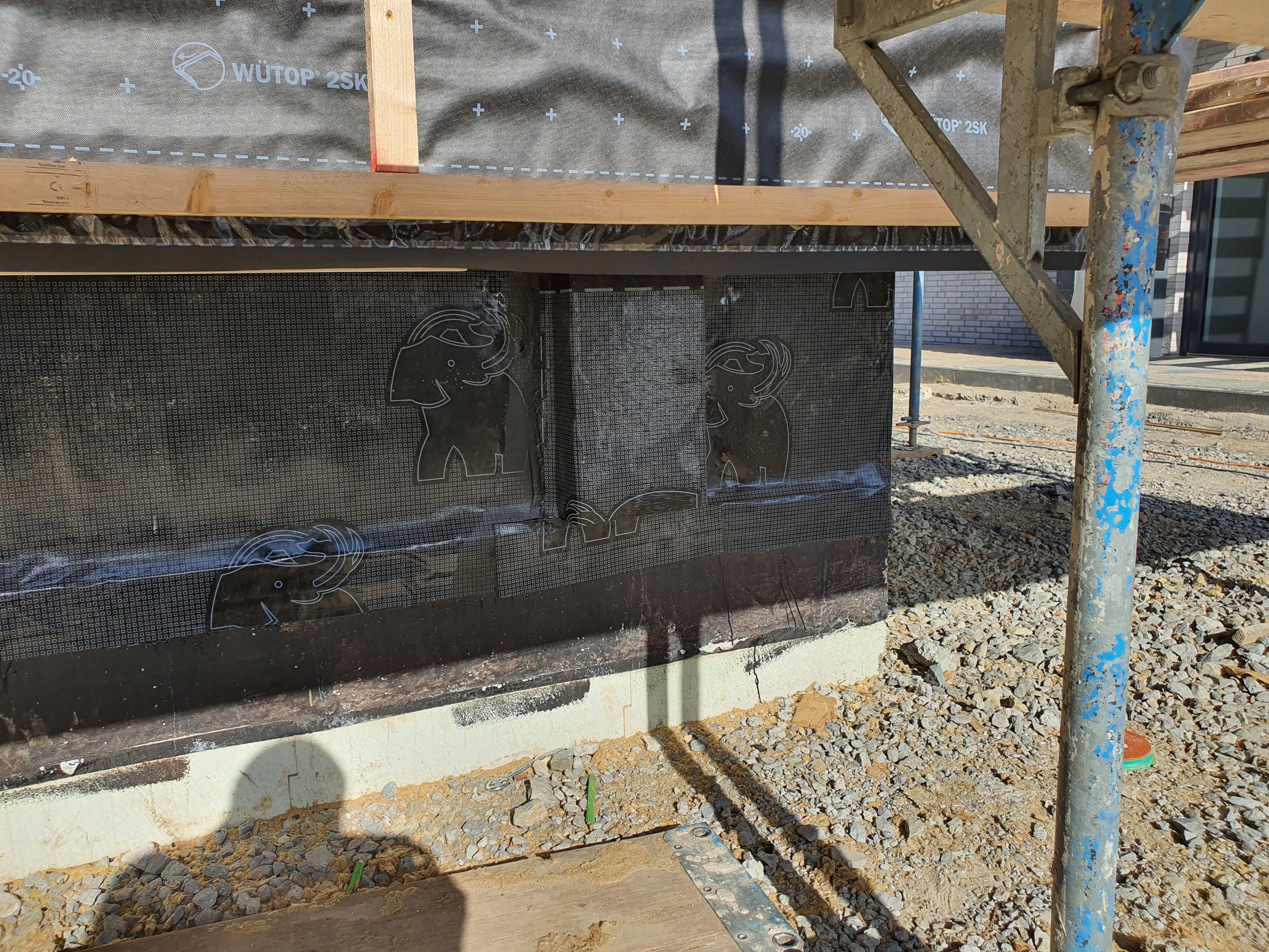 Hier mal Bilder von heute. Der im ersten Bild zu sehende untere schwarze Bereich ab ungefähr der Holzleiste bis zur Dämmung unter der BP wird mit 30cm XPS Perimeterdämmung gedämmt, nochmals abgedichtet und mit Sockelputz versehen. Die schwarze dünne Folie oben ist nur zum Schutz der fassade gegen Witterung bis der Putzer kommt.