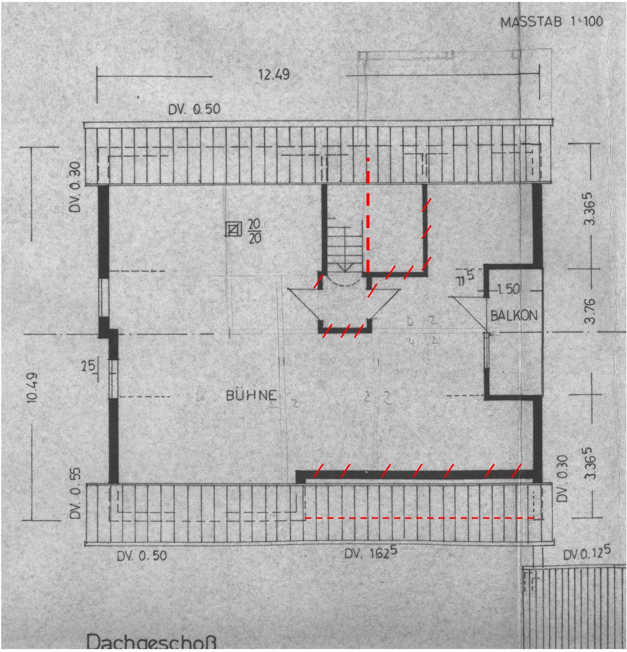 Durch die Dachschrägen verschenken wir jedoch jede Menge Raum. Wie in den Zeichnungen ersichtlich befindet sich zudem in 1m Abstand vom Kniestock ist nochmal eine Zwischenwand, Abstellraum der zwar für "kruschd" genutzt wird, aber besser nutzbar wäre, sofern die Dachschräge nicht da ware.