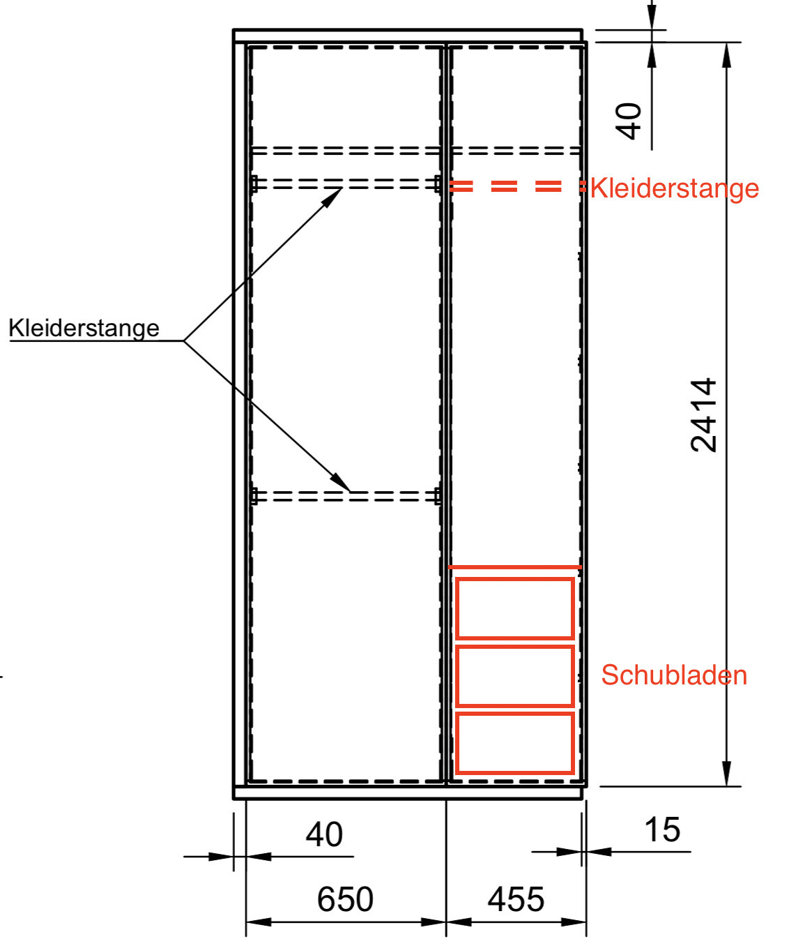 Und als Hinweis für die Stangeneinteilung ... wirklich mal die Länge einer Jacke auf dem Bügel messen. Denn da kommen zur Jackenlänge je nach Bügel schnell noch gut 10 bis 15 cm dazu. Also vielleicht im linken Teil die untere Stange eher Richtung 80 / 90 cm für die Kinder wählen, also wie Yvonne schreibt auf jeden Fall variabel halten.