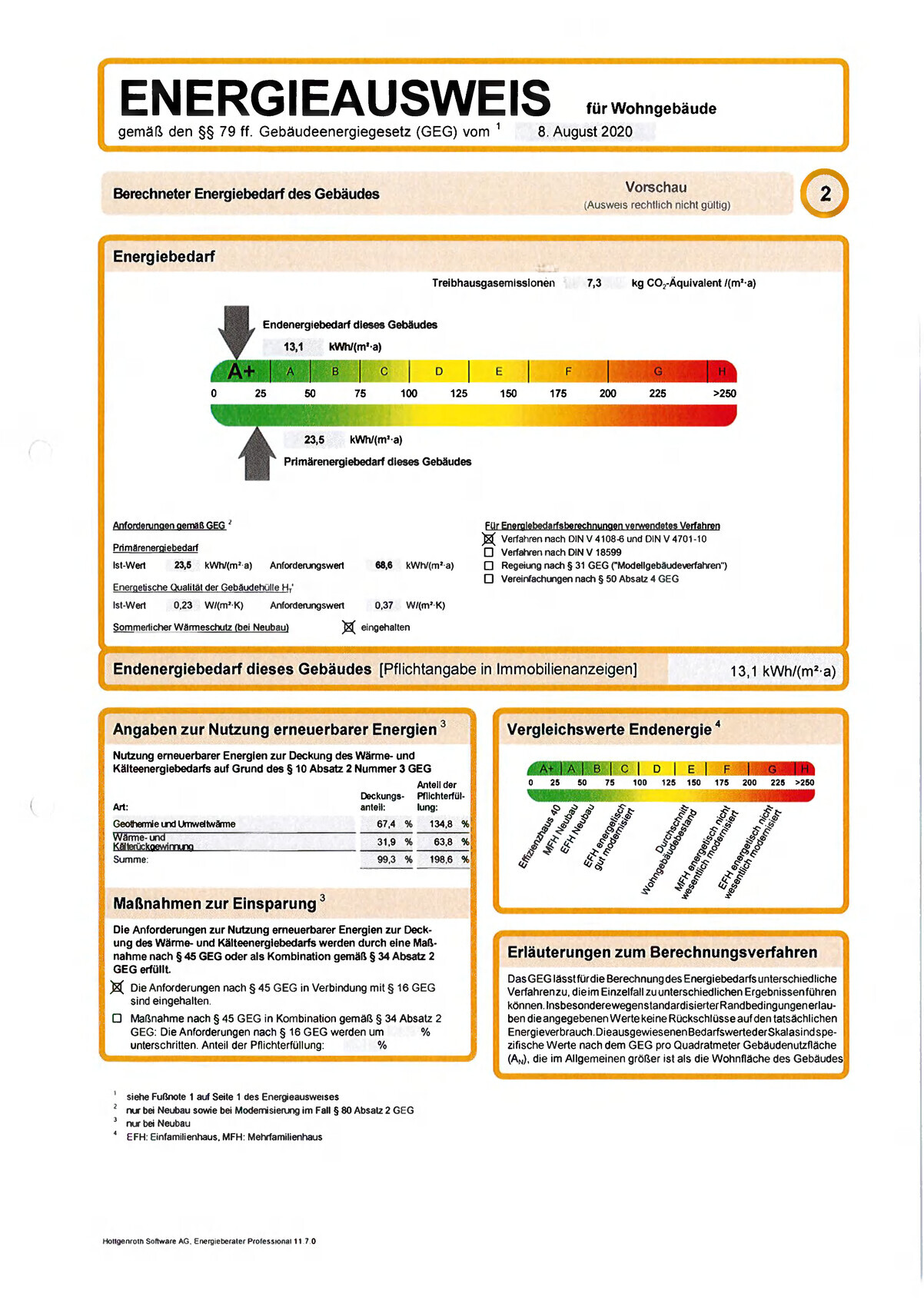 Ist-Wert 23,5 kWh/(qm a) und Anforderungswert 68,6 kWh/(qm a)