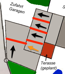 ja darunter sind überall Garagen. Ich habe mal eine Zeichnung erstellt. schwarze Pfeile sind genutzte Garagen. Der orange Pfeil ist zwar auch eine Garage aber in der anderen (großer Anbau) als Ausfahrt und derzeit nur Lagerraum. Dort wollten wir dann Heizung etc. installieren.