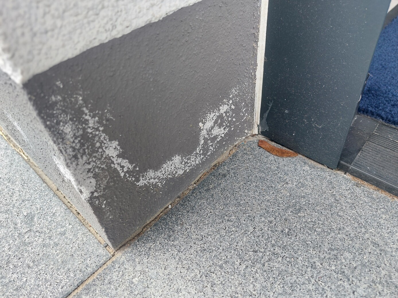 an unserer Haustür sind Ausblühungen im Sockelputz aufgetaucht. Aufgefallen sind die mir das erste Mal eine Woche vor Weihnachten. Die Bilder sind von gestern. Wenn ich die Bilder von Dezember und gestern vergleiche, scheint mir das eher etwas mehr zu werden.