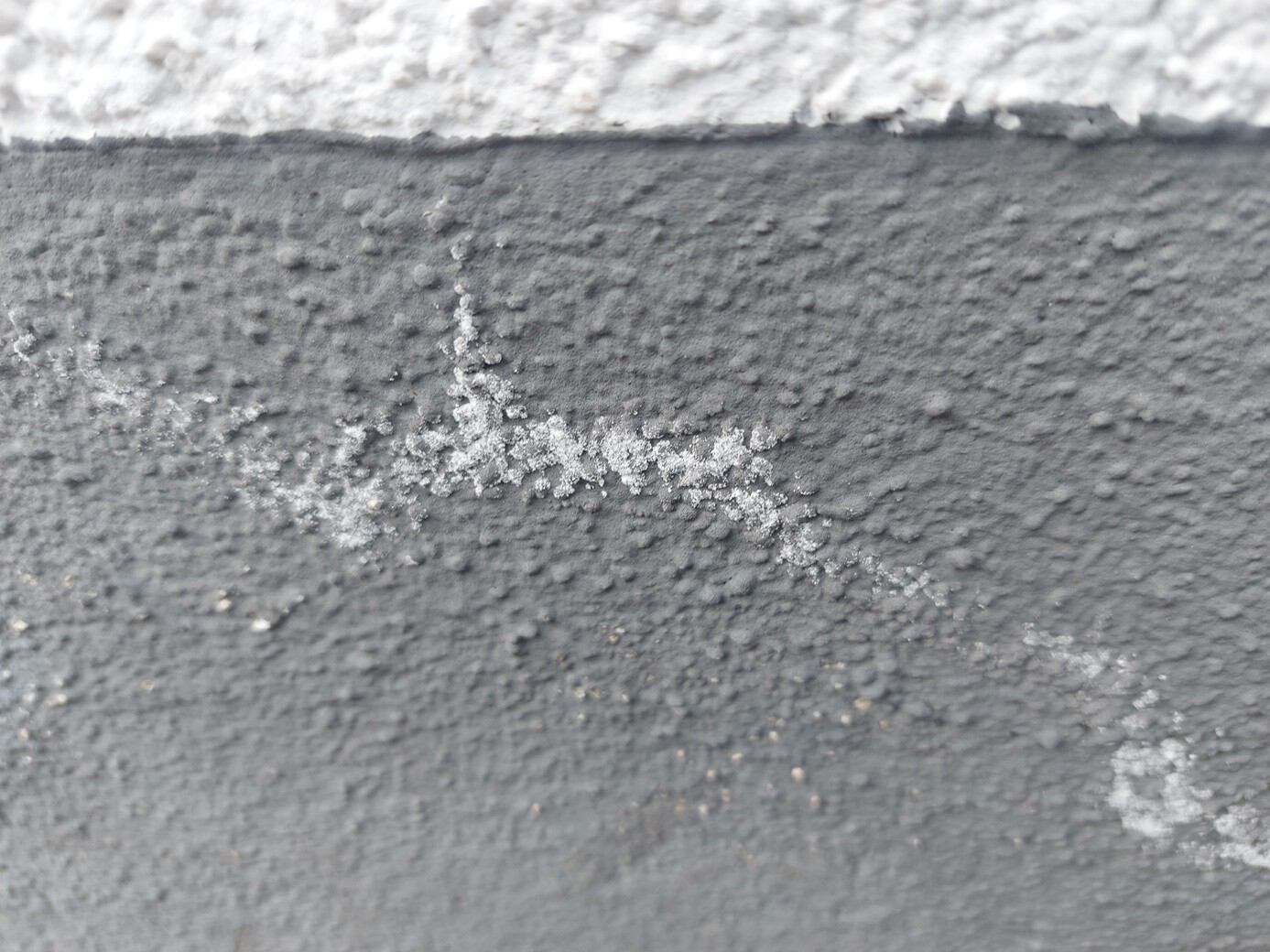 Die Frage ist nun, was ist da los? Sowas entsteht wenn Wasser in die Dämmung eindringt. Aber wo kommt das Wasser her? Das ist die Ostseite des Hauses, da kommt nur selten Schlagregen drauf. Der Dachüberstand schützt die Seite auch recht gut, der Bereich direkt an der Wand ist so gut wie nie nass. Es bleibt fast immer ein Streifen etwa in der Breite der Fußmatte trocken. Das Eingangspodest hat auch ein leichtes Gefälle vom Haus weg, das leitet also auch kein Wasser dahin.
