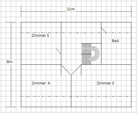 Die Treppe sollte auch in der Skizze schon realistischer bemessen sein: von einem Stufenmaß 19 cm hoch und 26 cm tief bräuchtest Du im Beispiel 2,65 m Geschosshöhe vierzehn Steigungen. Die Wand im Grundrißäquator steht so unter der Mittelpfette statisch schon mal gut.