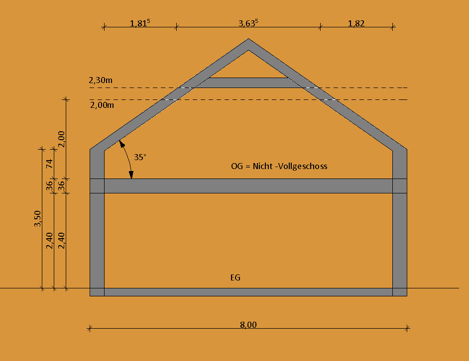 Die Geschossflächenzahl gäbe den Wunsch gut her, aber bei 3,50 m Traufhöhe und 35° DN sehe ich über dem OG kein weiteres Geschoss mit Stehhöhe herauskommen. In BaWü darf man glaube ich 2,30 m lichte Raumhöhe bauen, damit könnte man auf 2,65 m Geschosshöhe kommen. Das macht praktisch 85 cm Kniestock, und dann noch 1,80 m weitere Raumhöhe oben in der Schräge. Bei 35° DN und 8 m Haustiefe sehe ich den First nach 2,80 m kommen, und somit nur noch 1 m über dem OG. Ich kann mich ja verrechnen, aber auf den ersten Blick würde ich sagen: ein zweites OG/DG gibt es da nicht.