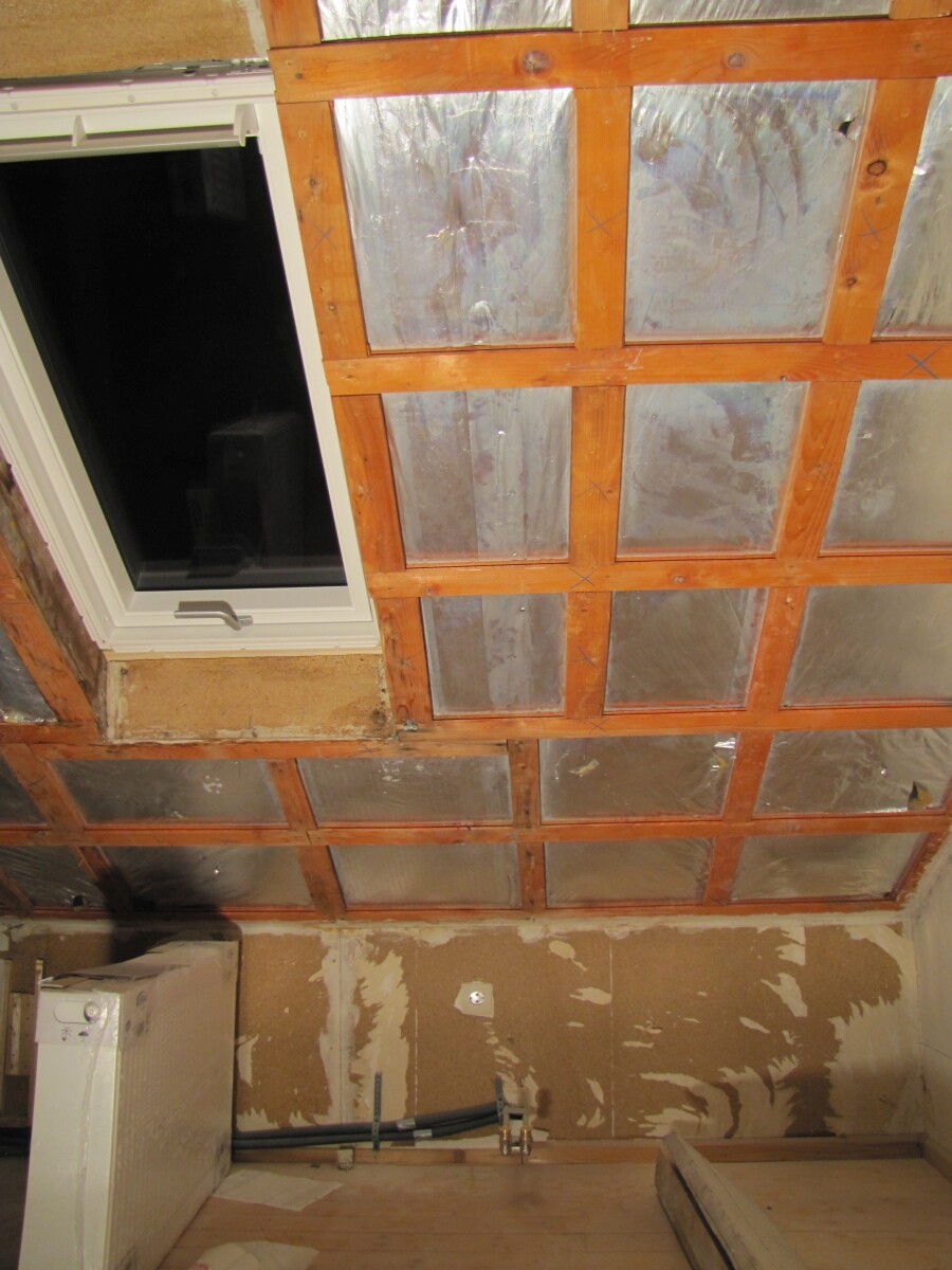 Bereits ausgebaut heißt, dass der Dachboden bei Kauf mit Holzdielen-Boden + Innendämmung (alukaschierte Dämmwolle) + Deckenverkleidung (Holzprofile) ausgestattet war (Eigenarbeit vom Vorbesitzer). Die alten Dachbodenfenster sind von uns bereits getauscht worden, die Holzprofile haben wir komplett abgemacht + entsorgt, da wir wissen wollten, wie es darunter aussieht und sich an einer Stelle bereits Siebenschläfer (oder sonstwer) durch die Dämmung gefressen hatten. Feuchtigkeit scheint bisher kein Problem gewesen zu sein, Deckenprofile + Balken waren alle trocken außer einer undichten Stelle durch verrutschten Ziegel (mittlerweile wieder gerichtet)