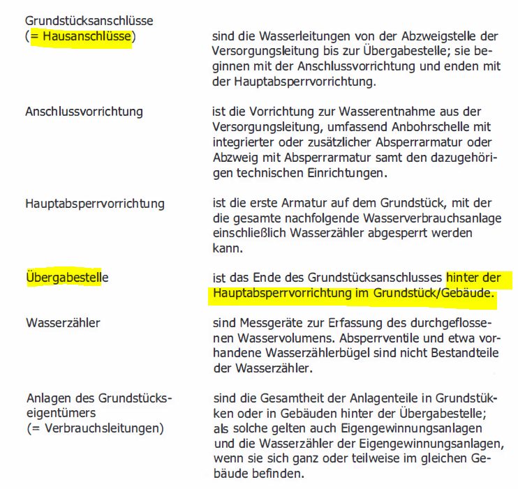 o, hier siehst Du, dass nicht Hausanschluss, sondern Grundstücksanschluss gemeint ist. Und Dein Denkfehler.Hallo ypg, danke für Deinen ausführlichen Beitrag.Tut mir leid, dass ich dir nicht direkt folgen kann. Wo genau siehst du meinen Denkfehler? Die Gemeinde ist zugleich Wasserversorger (sofern das Relevanz hat)
