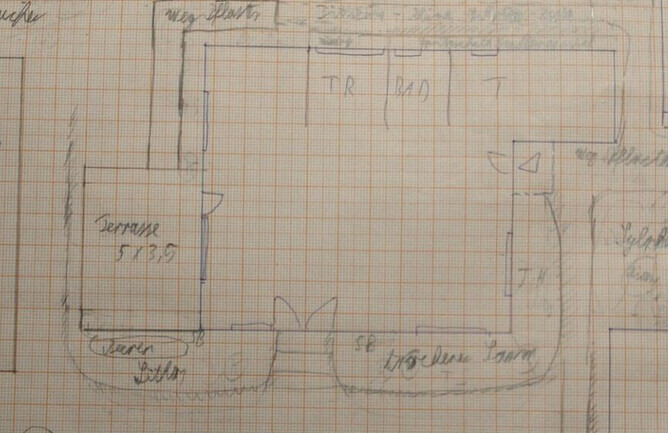 Terrasse: wird von der Hausecke bis etwa zum Küchenfenster überdacht