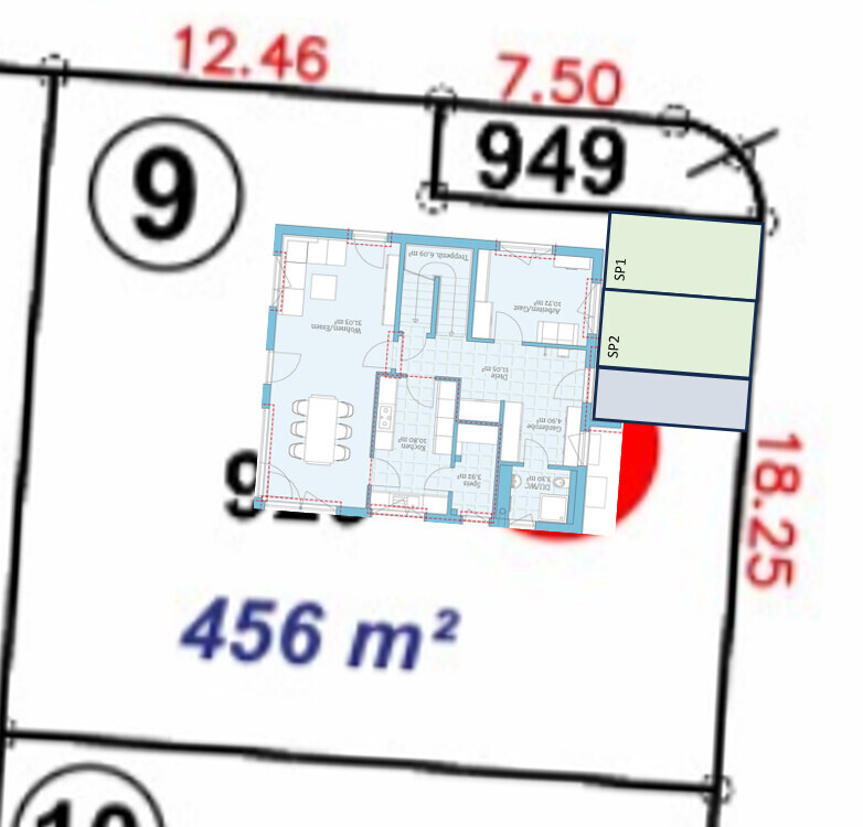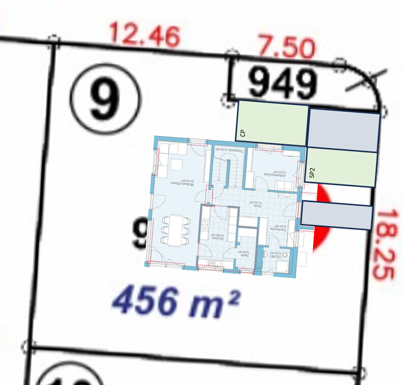 Die Idee war, dass der Hauseingang näher Richtung Osten rückt und ein kleiner Carport kurz vor dem Wohnzimmerfenster endet, davor der Stellplatz, damit man nicht allzu viele Quadratmeter an den Vorgarten verschenkt (also kein Stellplatz direkt vor dem Haus).