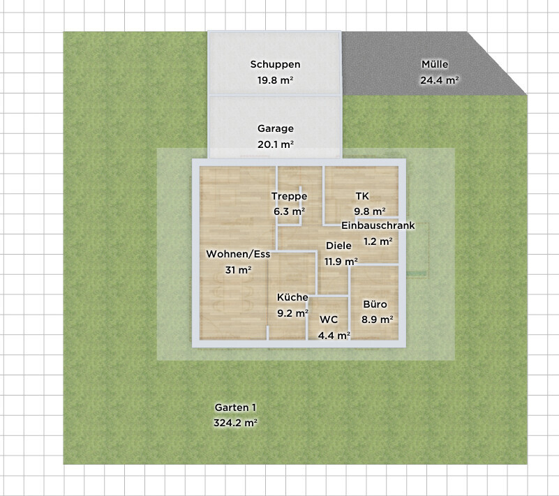 Grundriss eines Einfamilienhauses mit Wohnzimmer, Küche, Diele, WC, Büro, Garage und Garten.