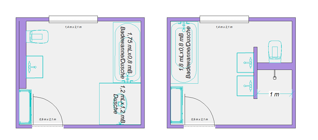 Ich finde Deine Entwürfe dementsprechend alle schlecht. Ich würde entweder bei der Wanne 5cm nachlassen und Dusche und Wanne planrechts setzen oder das T planen mit 1m Dusche und zusätzlicher Beleuchtung (da ein Fenster fehlt. ).