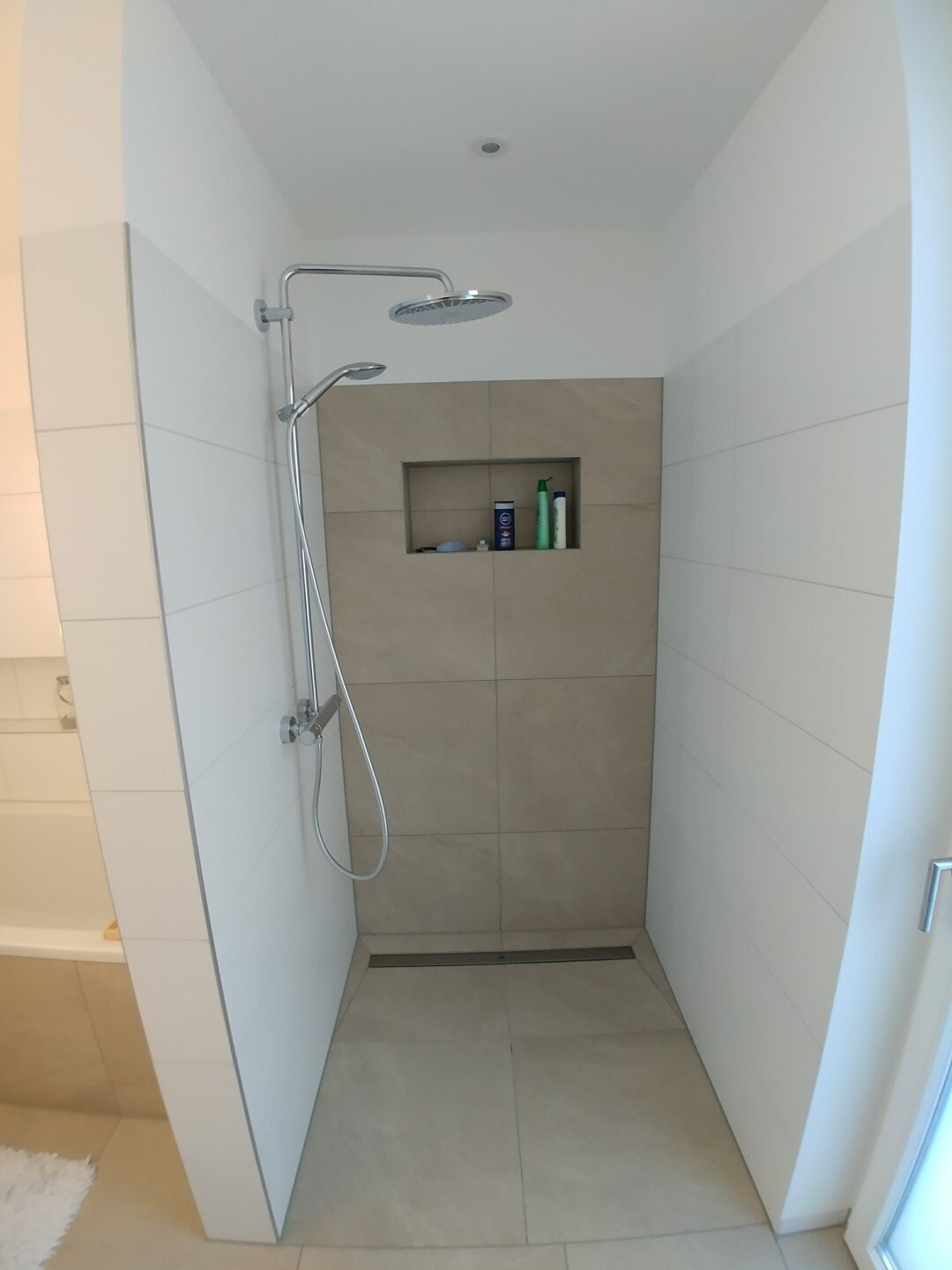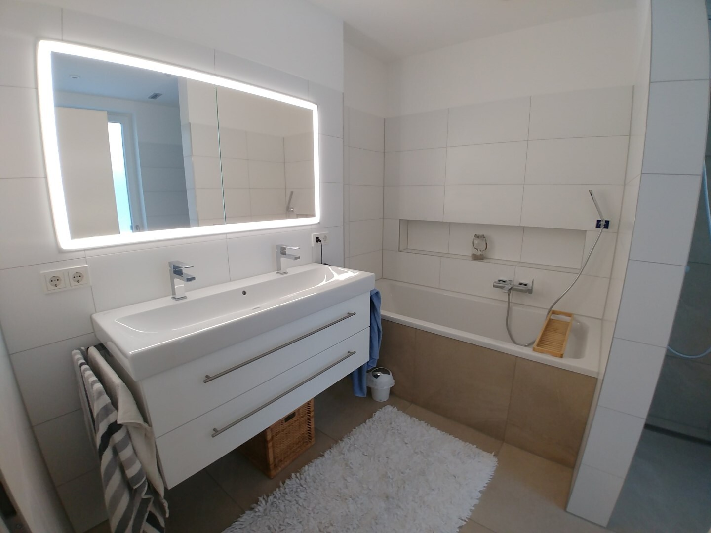 Unser Hauptbad ist mittlerweile soweit fertig, es fehlt noch die Glaswand bei der Dusche, Badetuchhalter und die Beleuchtung in der Badewannennische läuft auch noch nicht.