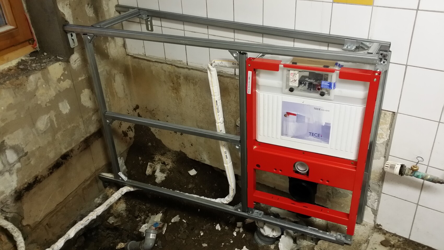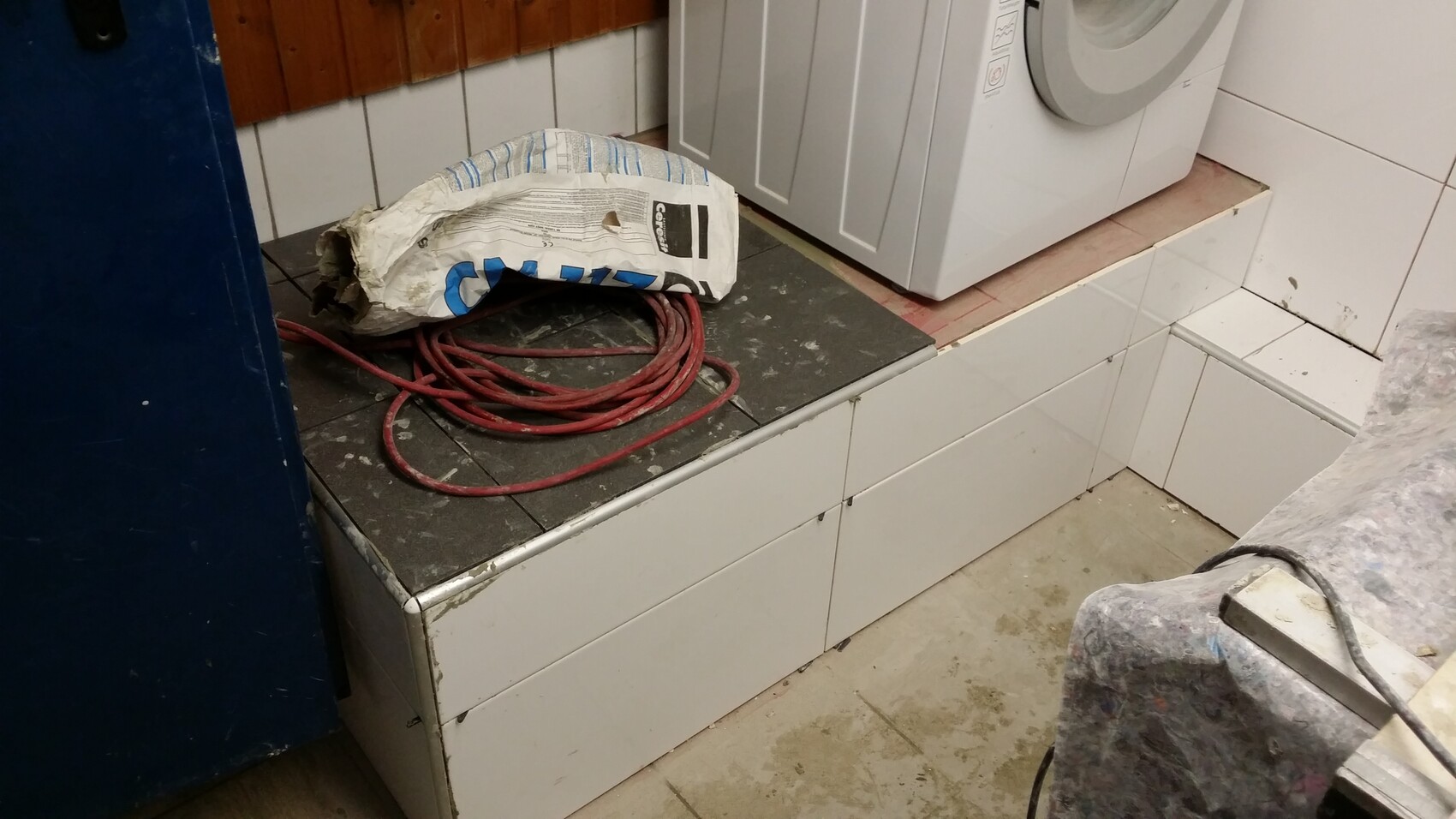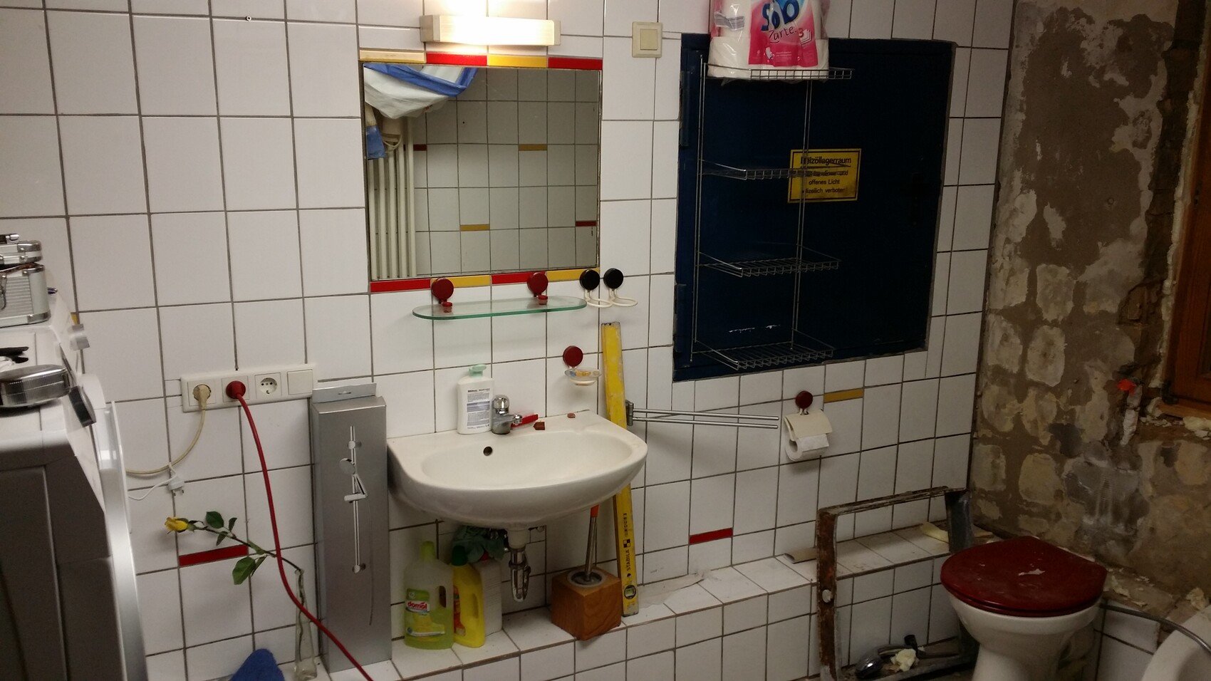 Inzwischen ist sogar "neuer Strom" ins Bad gekommen und man darf Waschmaschine und Trockner gleichzeitig anmachen. Vorher 3x 1.5mm² und hing mit irgendwas zusammen. Nun separat abgesichert (Unterverteilung im Keller mit eigenem FI)