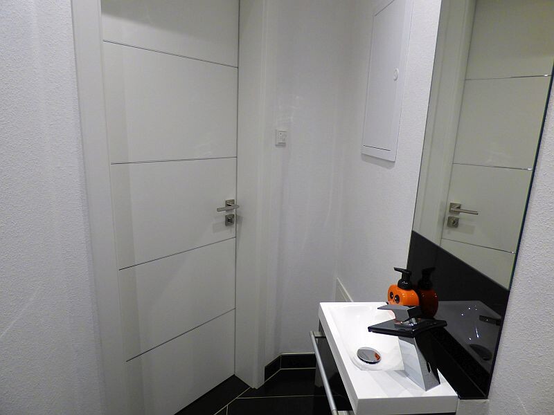 Da das Gäste-WC sehr lang ist, haben wir uns kurz entschlossen, die Wand am Eingang schräg zu setzen. Das schafft ein wesentlich besseres Raumgefühl im Flur davor und ich meine, das hat so etwas mehr Pfiff
