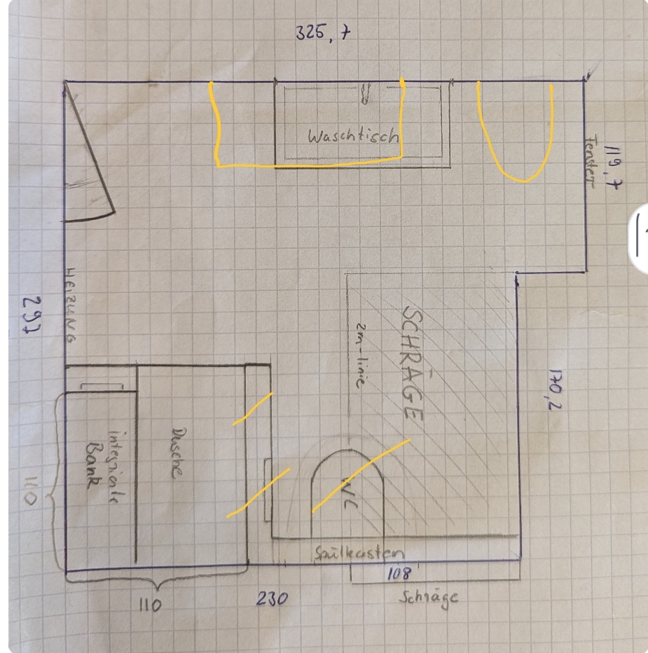 Das war ursprünglich unsere Überlegung, aber fann bleibt eben so ein Loch unter der Schräge. Oder ich habe nicht richtig verstanden, wie du es mit der Dusche meinst?