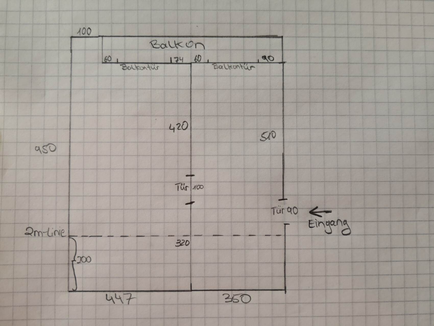 Da hier so viel Feedback kommt, habe ich mal schnell eine Skizze des geplanten Elterntraktes gemacht. Maße bitte nicht zu genau nehmen, teilweise gerundet bzw. vor Ort gemessen und dank schiefer Wände/Putz nicht immer zueinander passend. Nur, damit ihr es euch vorstellen könnt.