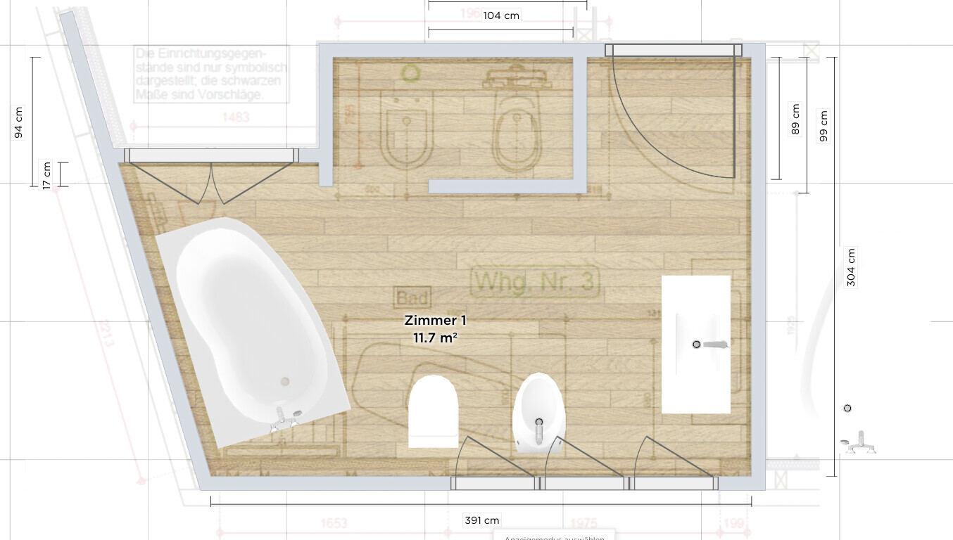 mal eine ganz andere Frage: Wäre es besser, auf das WC zu verzichten, damit mehr Platz gewonnen wird? Oder anders gefragt: ist das Bad zu voll? Ich habe ein Gäste-WC im Flur, könnte also auf das WC im Bad verzichten. WC im Bad hat ja immer so seine Vor- und Nachteile...Ich denke, Platz ist nicht das Problem und ich persönlich würde nicht auf ein WC verzichten wollen. Gerade mit zwei Personen + ggf. Gäste ist es gut das getrennt zu haben.Ich persönlich finde die Vorschläge alle super, würde vielleicht aber noch eine kleine Trennwand an den WCs für die Privatsphäre einfügen. Und ansonsten kann ich nur empfehlen dir die Möbel + Grundriss + ggf. einzufügende Wände einmal auszudrucken, auszuschneiden und dann einfach mal auf dem Grundriss platzieren und herumprobieren. So haben wir das damals gemacht und das hat uns sehr geholfen. Das macht es vielleicht auch für deine Mutter einfacher sich damit zu beschäftigen.
