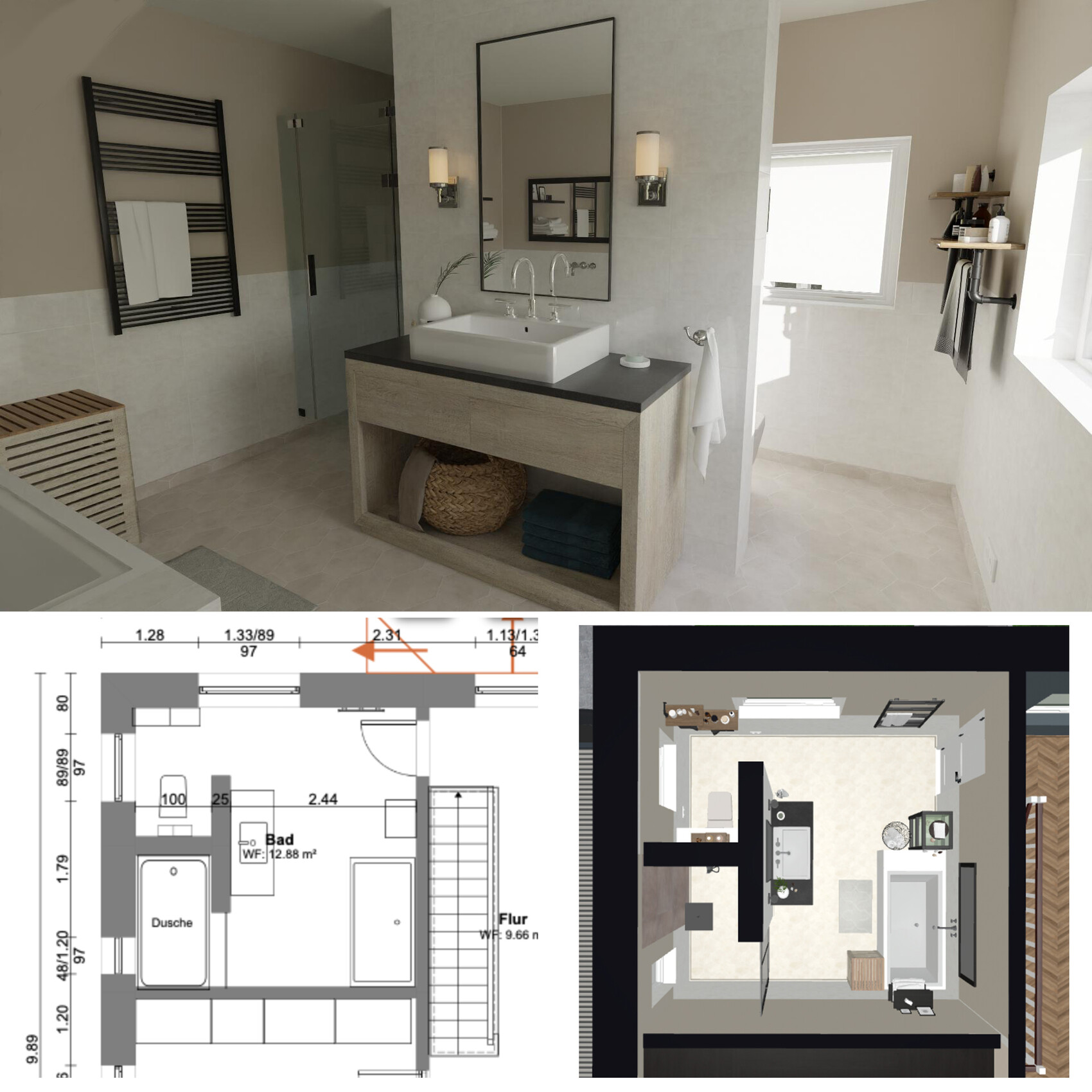 Natürlich auf keine der beiden. Bei einer Badplanung muss man nicht reparieren. Da plant man neu und zwar in einem Raum, nicht in zweien.Natürlich geht es hier auch um eine Neuplanung, ich habe nie das Gegenteil gesagt. Ich habe lediglich nachgefragt, weil ich wissen wollte, wo du das L platzieren würdest. Das war für mich nicht eindeutig. Hab als Alternative mal diese T-Lösung probiert. Was denkt ihr?