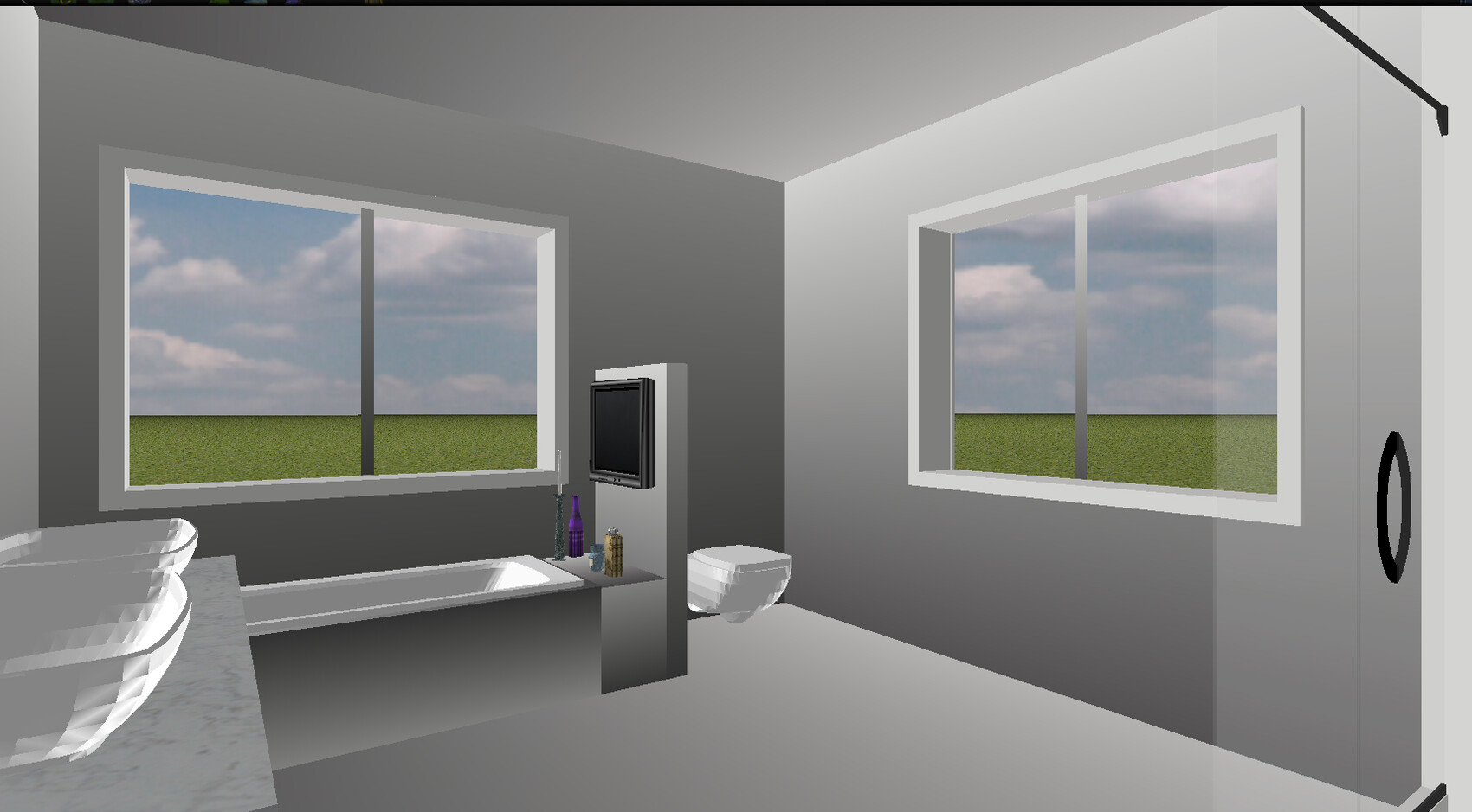 3D-Badzimmer mit Badewanne, Toilette und zwei großen Fenstern