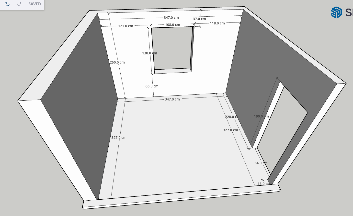 Angefügt habe ich eine bemaßte Skizze des Raums und der Entwurf, der uns gegenwärtig vorschwebt.