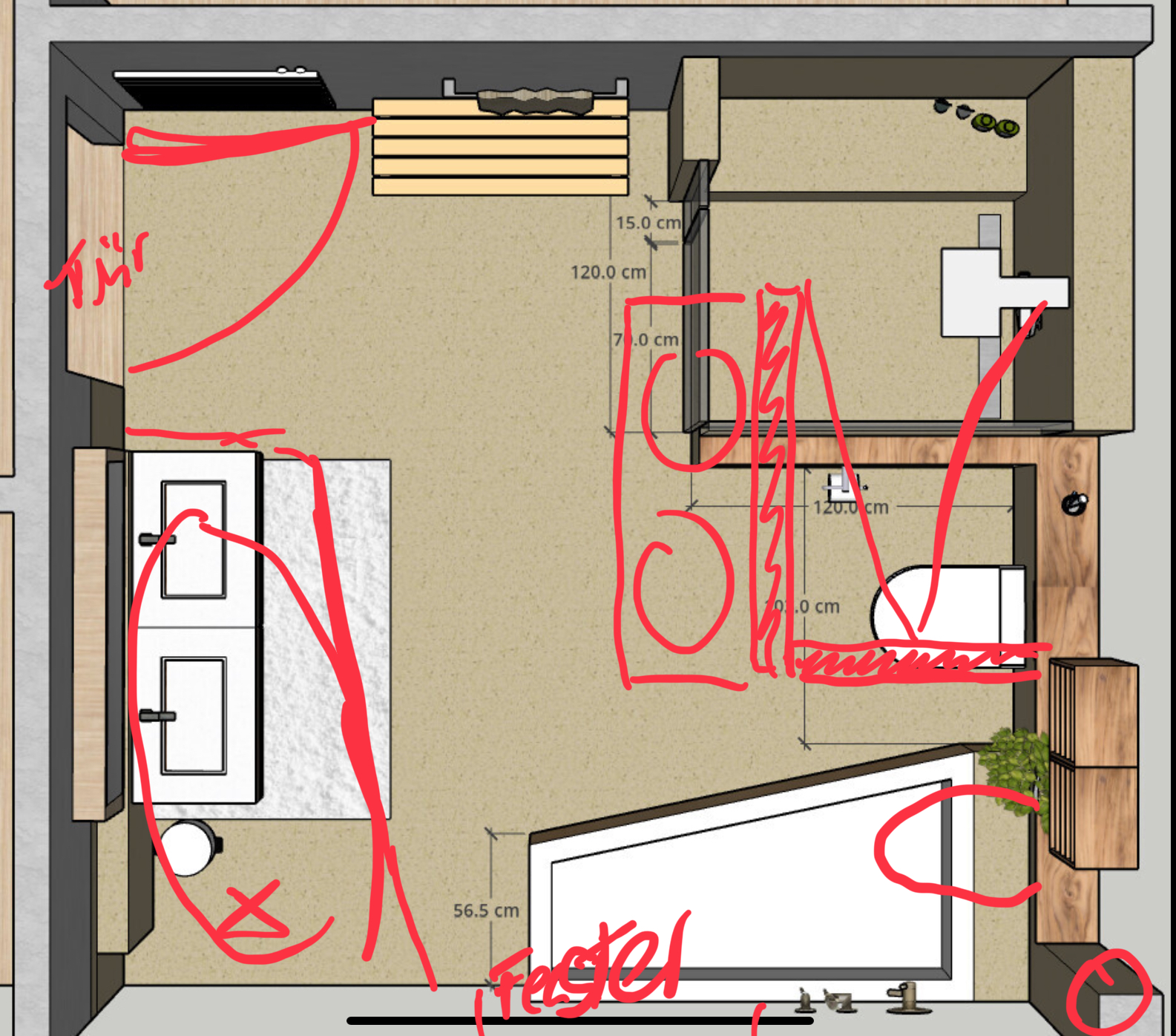 Langsam sollten wir uns nun bei der Badplanung entscheiden. Da ich die Anordnung inzwischen unzählige Male über den Haufen geworfen und neu gestaltet hab, beschleicht mich langsam die Befürchtung, betriebsblind bei der Planung zu werden. Ich wäre daher für eure Kritik und Anregungen sehr dankbar!