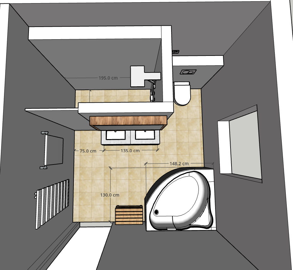 Die Eckbadewanne müssten wir sorgfältig auswählen, möglichst kompakt, ohne dass es unbequem wird.