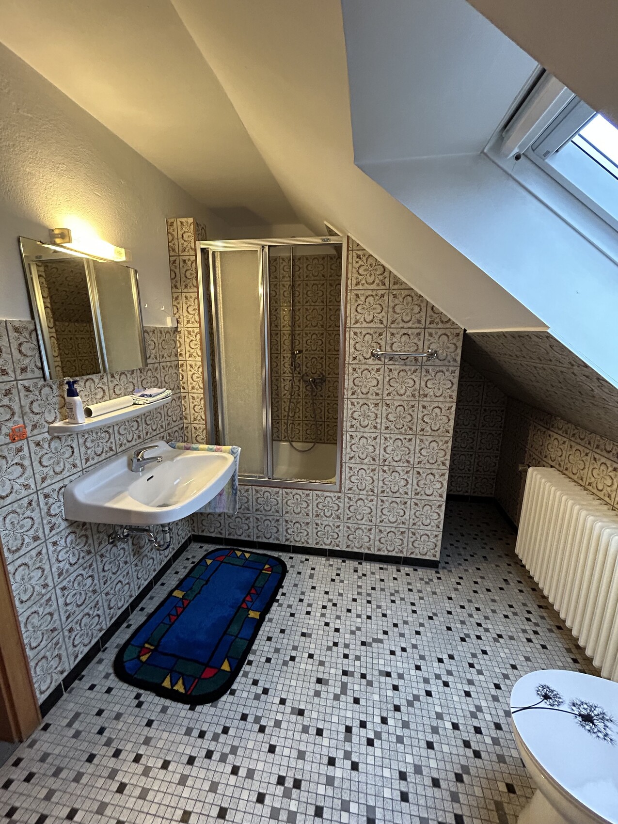 Dusche: am liebsten eine Glas-Pendeltür, da eine einfache Glaswand vermutlich wegen der Dachschräge schwierig wird