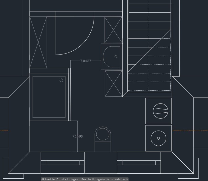 ich komme aktuell beim Bad OG nicht weiter. Auf den Bildern sind verschiedene Möglichkeiten der Anordnung, die mir mal eingefallen sind zu sehen. Jedoch bin ich noch nicht so recht zufrieden mit diesen. Insbesondere die Durchgangsbreiten machen mit etwas Kopfzerbrechen.