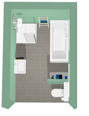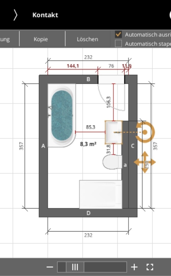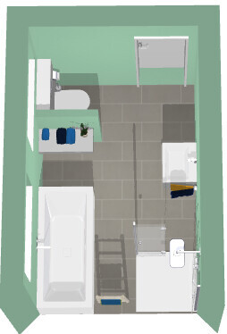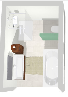 Der grüne Entwurf gefällt mir ganz gut. Die Dusche kommt mir etwas klein vor. Die dürfte bei mir noch weiter in das Eck wachsen, in dem momentan der Handtuchhalter häng. Ich denke, dass du das gleiche Problem wie ich hast und mit den Vorlagen arbeiten musst, die das Programm hergibt.