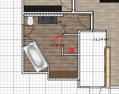 Ich hatte überlegt in Richtung Waschtisch an Wand B, Toi an Wand D, Wanne an Wand F- fand das auch ganz cool bis ich bemerkt habe dass die Dusche keinen Platz mehr findet :-D