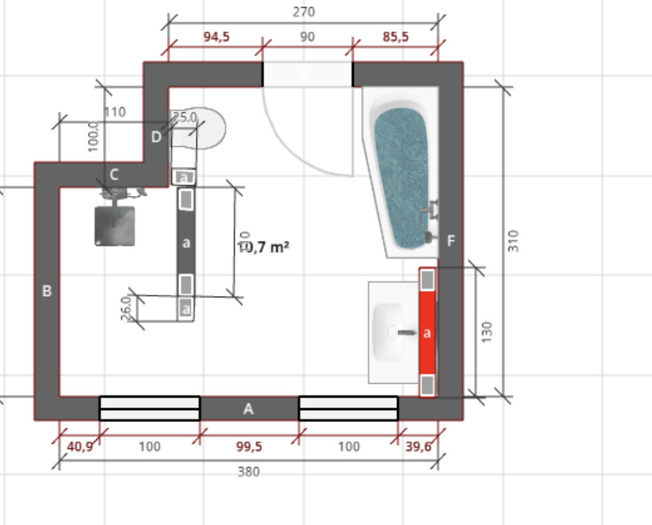 Die Wand muss eine Kippfestigkeit bekommen. also an einer festen Wand. Wenn es trotzdem geht mit der Wand, dann würde ich wieder bei meinem Vorschlag aus #20 hinweisen und wie @minimini vorgeschlagen, das verlängerte Stück der Wand als niedrige Ablage hinter der Wanne ausarbeiten. Das würde dann auch der Standfestigkeit dienen können.