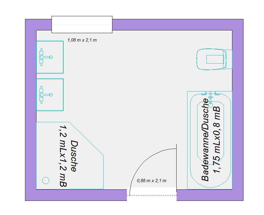 Auf einer unserer Bauträgerskizzen ist die Toilette oben rechts, die Badewanne unten rechts, das Waschbecken oben links und die Dusche unten links angeordnet.