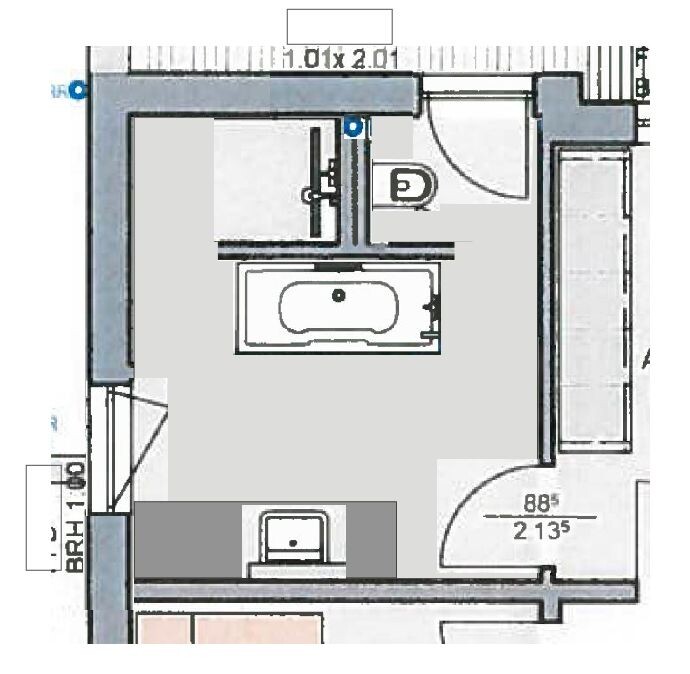 Ok, verwerfen wir den Gedanken an die Wanne in der Mitte. Dass wir in diesem überschaubaren Bad keine komplett freistehende Wanne realisieren können, war ohnehin von Anfang an klar.