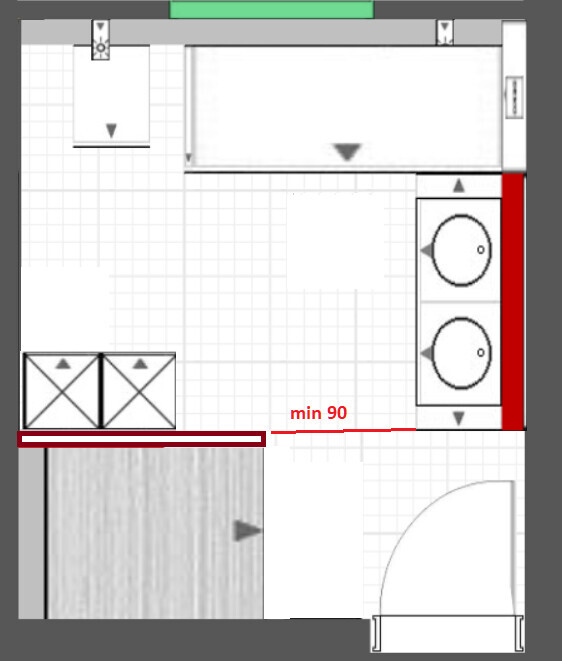 - Die Entlüftung des Abwasserrohrs Richtung Dach müsste an die Toilette angeschlossen sein. Würde sich ggf. durch einen raumhohe Vorwand beim Klo erreichen lassen, wahrscheinlich ist aber Anbindung der anderen Sanitäranlagen schwierig.