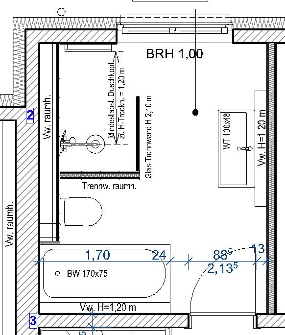 Wär halt immer sinnvoll in solchen Posts mit weiterführenden Fragen einfach nochmal das Bild des letzten Planungsstandes mit einzubinden 😉Klar, Entschuldigung!Hier der Grundriss, die Wand zwischen Dusche und Toilette ist halbhoch, darüber Glas und die Vorwand hinterm Klo voraussichtlich ebenfalls halbhoch (1,20m).