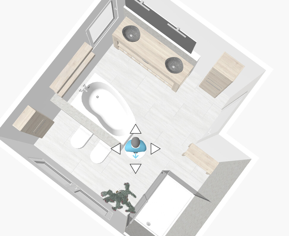V1 löst eigentlich alle Probleme des Raums; Ich bin zwar kein Fan von Eckbadewannen, aber da findet sich bestimmt ein hübsches Modell.