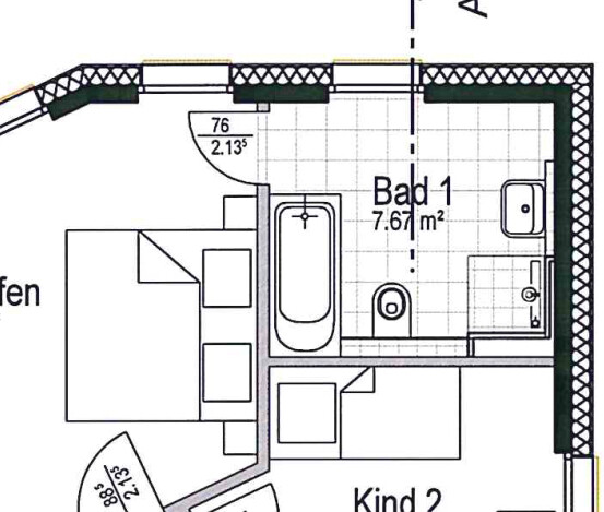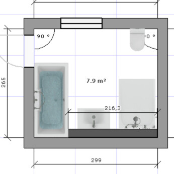 Das Bad ist 2,9m x 2,6m und nur für uns Eltern gedacht. Badewanne wird genutzt solange die Kinder noch klein sind.